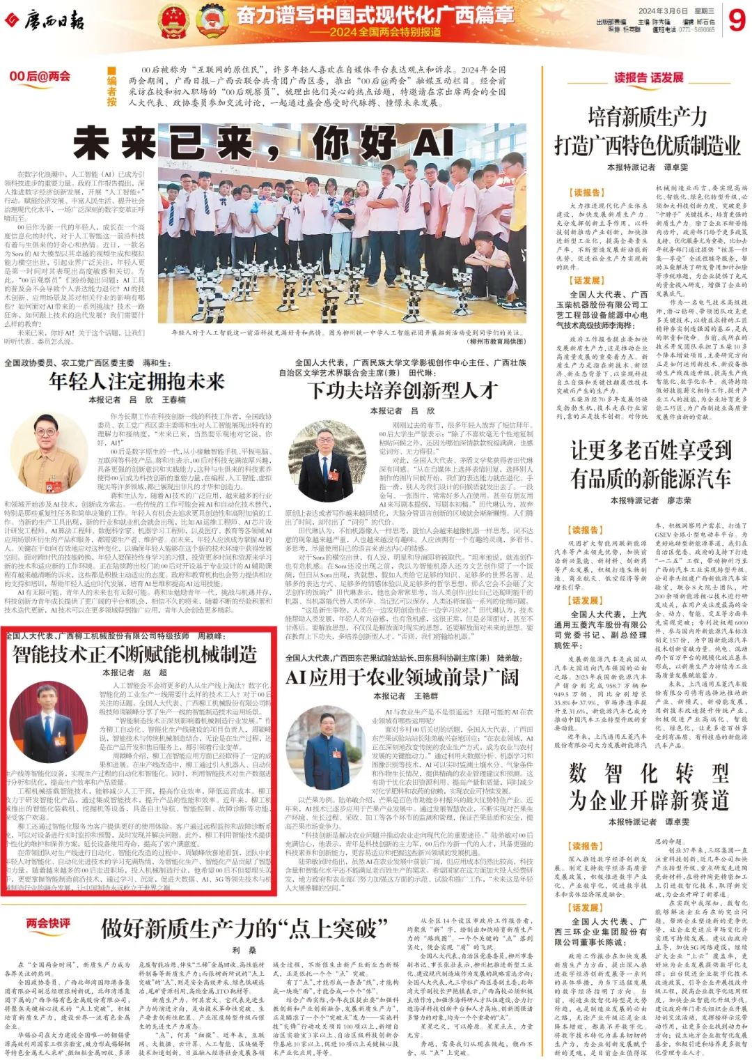 3月5日,第十四届全国人民代表大会第二次会议在北京人民大会堂开幕。全国人大代表、广西柳工机械股份有限公司数控车工特级技师周颖峰认真履职尽责,积极建言献策。今年两会,周颖峰重点围绕制造业转型升级以及转型升级之后的人才培养这两大方向提出建议,近日,《人民日报》《中国青年报》《广西日报》、广西广播电视台等多家媒体聚焦。