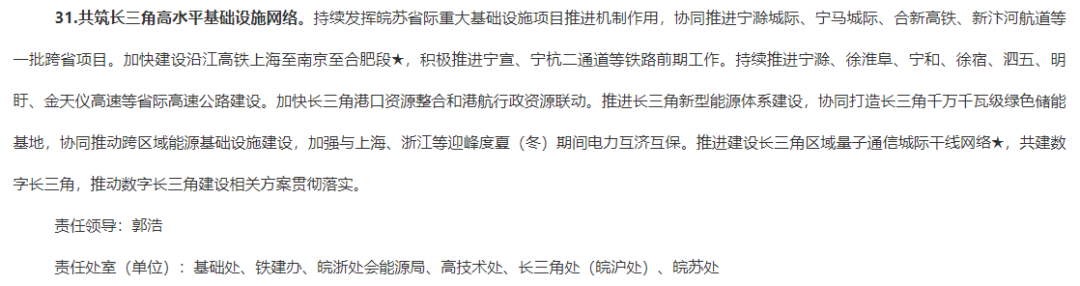 (1)推进长三角新型能源体系建设,协同打造长三角千万千瓦级绿色储能基地,协同推动跨区域能源基础设施建设,加强与上海、浙江等迎峰度夏(冬)期间电力互济互保。