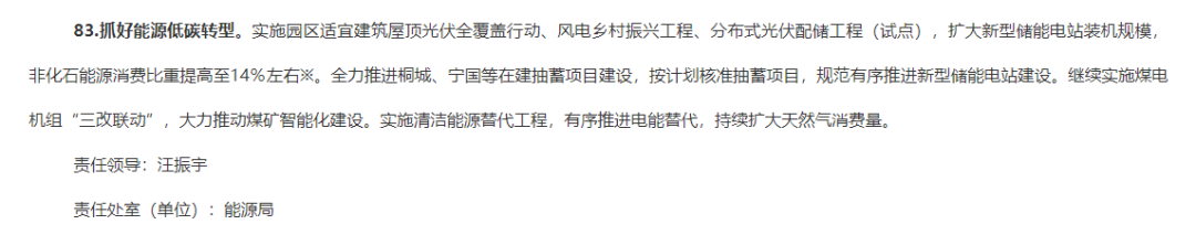 (4)与此同时,文件还对分布式光伏配储作出指示:抓好能源低碳转型。实施园区适宜建筑屋顶光伏全覆盖行动、风电乡村振兴工程、分布式光伏配储工程(试点),扩大新型储能电站装机规模,非化石能源消费比重提高至14%左右※。全力推进桐城、宁国等在建抽蓄项目建设,按计划核准抽蓄项目,规范有序推进新型储能电站建设。继续实施煤电机组“三改联动”,大力推动煤矿智能化建设。实施清洁能源替代工程,有序推进电能替代,持续扩大天然气消费量。
