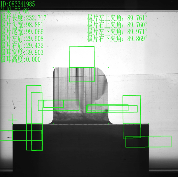 尺寸测量:该方案可检测极片长宽、极耳长宽、极耳边距、V角形状高度、宽度、角度或面积,极片对角线等尺寸。