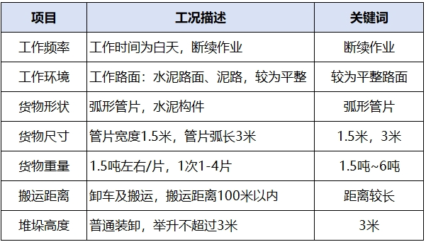 1)机型:货物最重在6吨左右(4片管片),根据实际调研搬运货物尺寸、重量,需要10吨叉车才能满足工况要求;