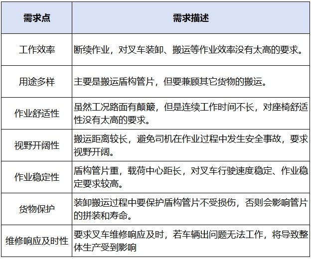 客户属于建筑行业,流程制度有严格要求,对叉车使用的稳定性、安全性有较高的要求,具体需求点如下: