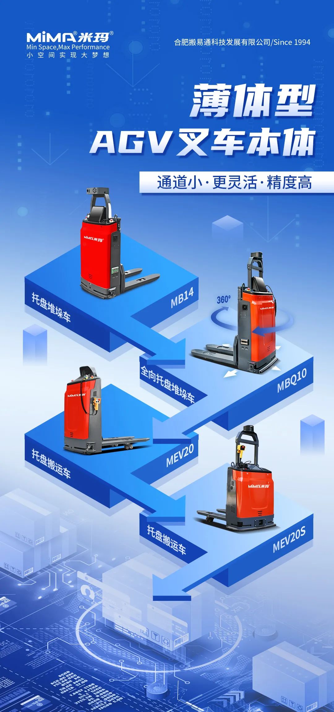 MiMA米玛推出系列化薄体AGV搬运车及堆垛车,满足仓库内窄通道、多楼层、中短途物料智能搬运及堆垛,高效、精准、安全、环保、经济价值高。
