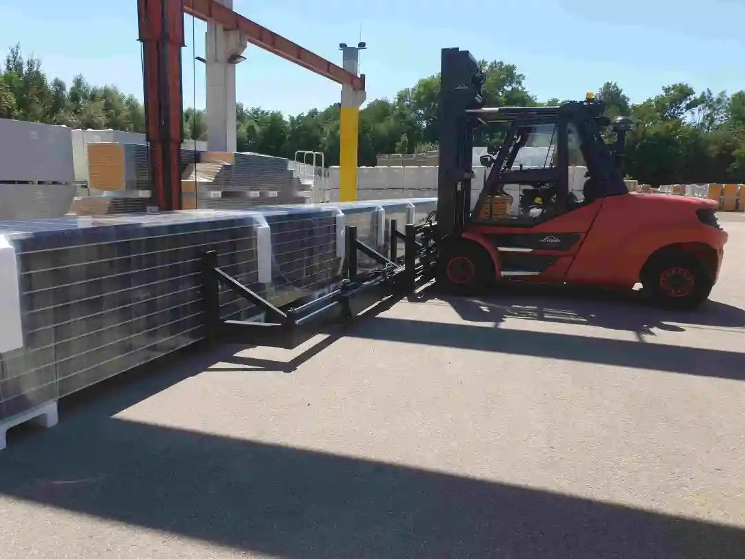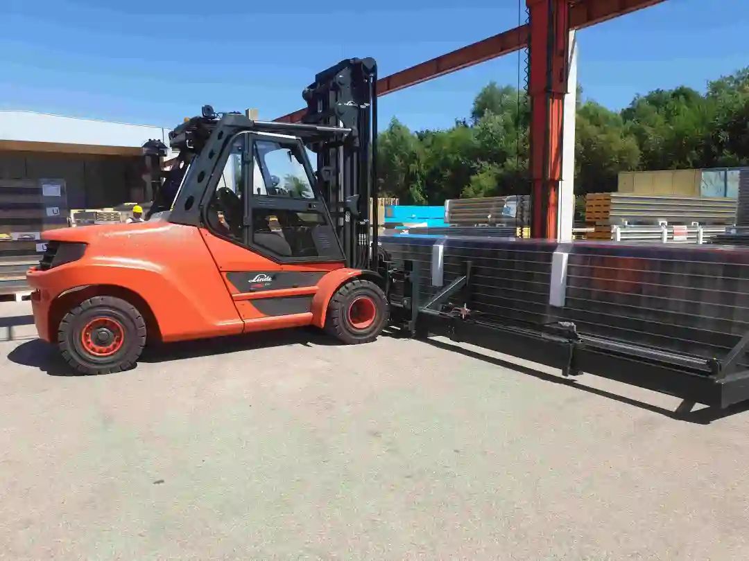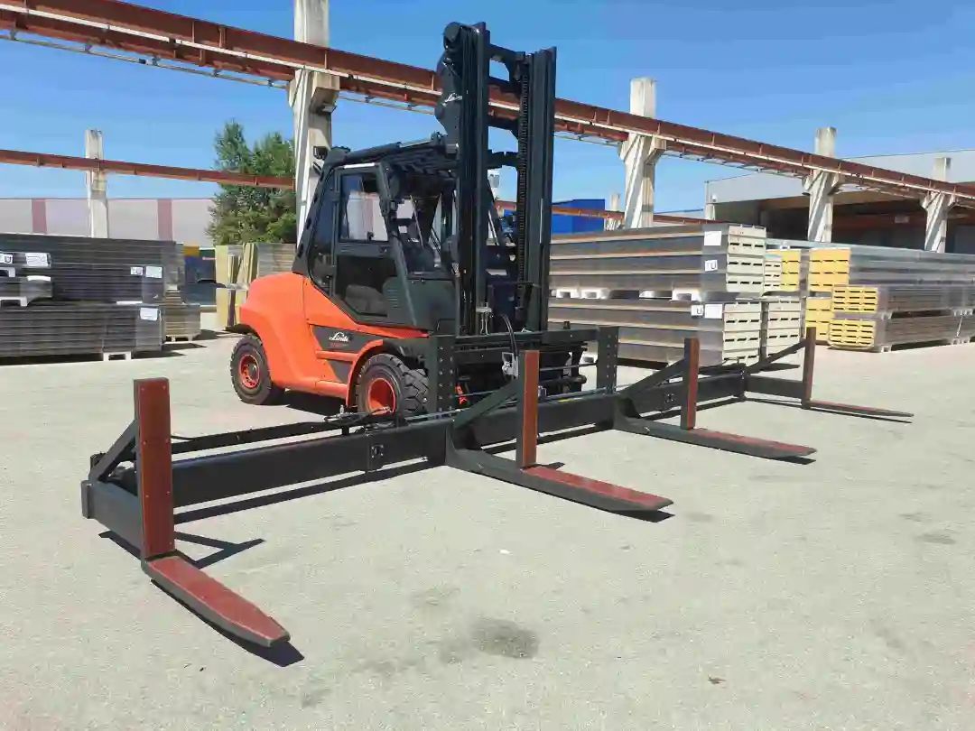 This is something extraordinary, to which we have given the name: Slip-on hydraulic Cross Girder. Our customer can transport large-dimensioned long goods with this Cross Girder that can be directly attached to the forks. Special highlight: the outer additional forks are not fixed, unlike the standard attachment, but can be moved hydraulically.