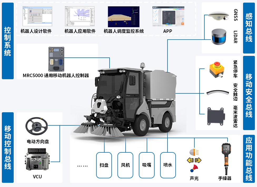以MRC5000为核心控制器,构建无人清扫车解决方案。根据移动机器人的整机功能,主要分为控制系统、移动控制总线、感知总线、移动安全总线、应用功能总线等五大单元模块构成。
