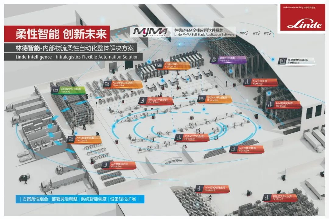 从顶层的应用软件系统到调度系统,再到执行搬运任务的物流设备,林德智能为客户提供端到端的整体解决方案,打造一体化全栈式创新交付平台。林德智能内部物流柔性自动化系统包括:自主研发的上位系统MyMA全栈应用软件(WMS/WES/WCS等)、移动设备调度系统E'tricc以及Flex系列移动自动化硬件产品,如FlexRobot叉式托盘搬运存取机器人,FlexCarrier潜伏及箱式搬运存拣机器人,FlexCube四向穿梭车,FlexHotel堆垛机立体库,FlexShuttle多层穿梭车料箱库等。
