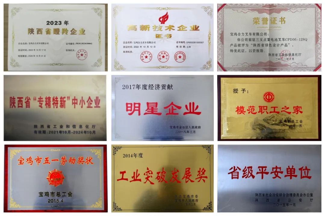 宝鸡合力是安徽合力股份有限公司的全资子公司,公司被认定为国家高新技术企业,拥有创新型中小企业、瞪羚企业、陕西省“专精特新”中小企业、陕西省省级企业技术中心、陕西省工业设计中心等荣誉,历年来还获得过陕西省百强企业、陕西省先进企业、陕西省制造业信息化优秀示范企业、陕西省装备制造业最具发展潜力企业、陕西省经济技术创新优胜企业、宝鸡市最佳经济贡献企业、宝鸡市职工经济技术创新优胜单位、宝鸡市五一劳动奖状单位、宝鸡市工业贡献奖等称号。