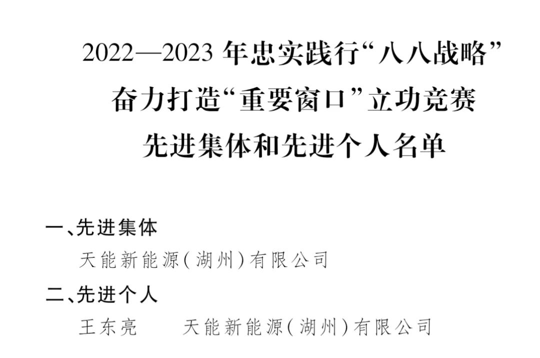 近日,浙江省政府印发《关于表彰2022—2023年忠实践行“八八战略”奋力打造“重要窗口”立功竞赛先进集体和先进个人的决定》,天能新能源 (湖州)有限公司荣获“先进集体”,天能新能源 (湖州)有限公司项目部副总监王东亮荣获“先进个人”。
