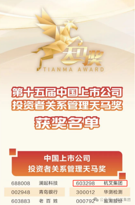杭叉集团| 喜报!杭叉集团荣获第十五届中国上市公司投资者关系天马奖