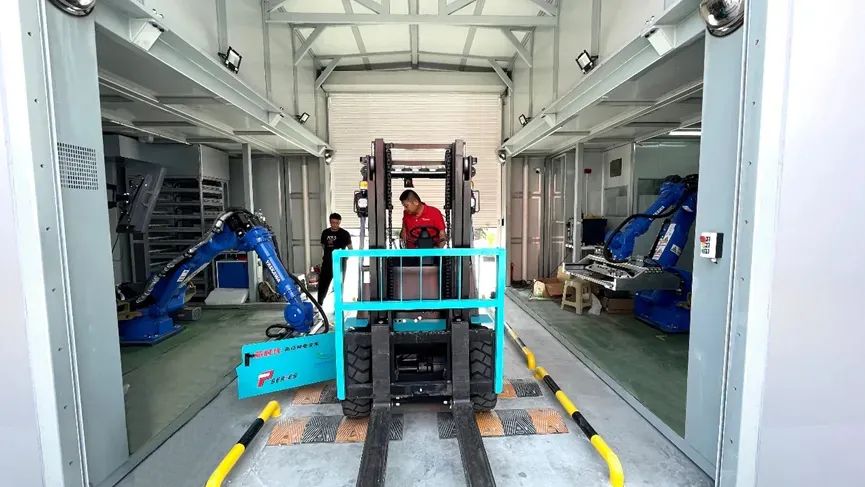 芯时代换电叉车搭载了车规级锂电池,支持车电分离,采用通用换电技术补能。比如,以往传统模式下需要数小时充电,使用换电柜和换电设备即可实现3分钟快速换电。
