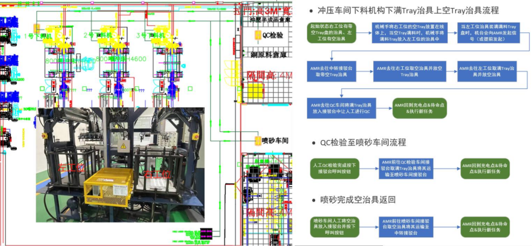 02 导入智能物流系统实现冲压车间下料机构下满Tray治具及上空Tray治具、冲压半成品仓库QC检验、喷砂车间上满Tray治具、电镀车间上满Tray及下空Tray治具;