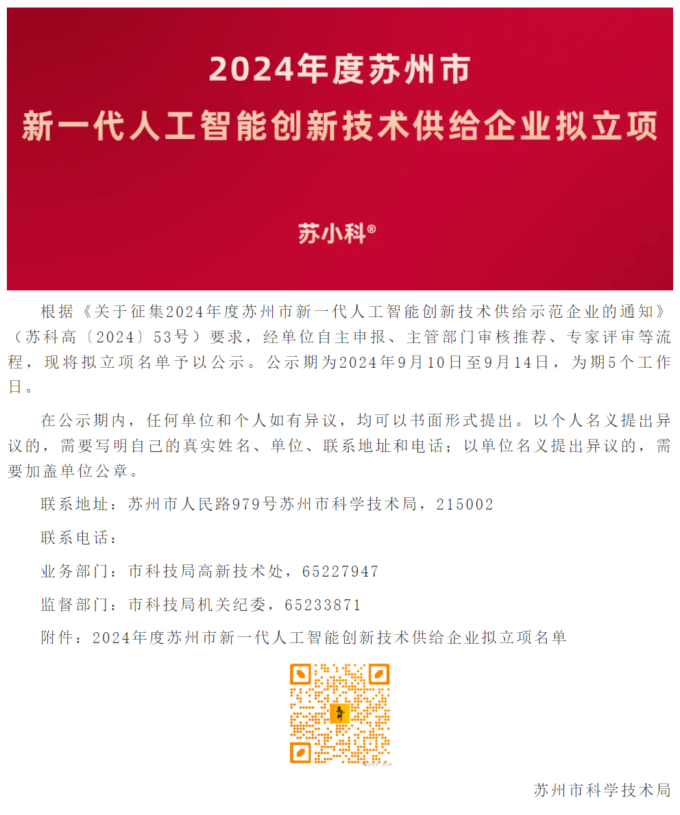 根据《关于征集2024年度苏州市新一代人工智能创新技术供给示范企业的通知》(苏科高〔2024〕53号)要求,经单位自主申报、主管部门审核推荐、专家评审等流程,现将拟立项名单予以公示。(现已结束)
