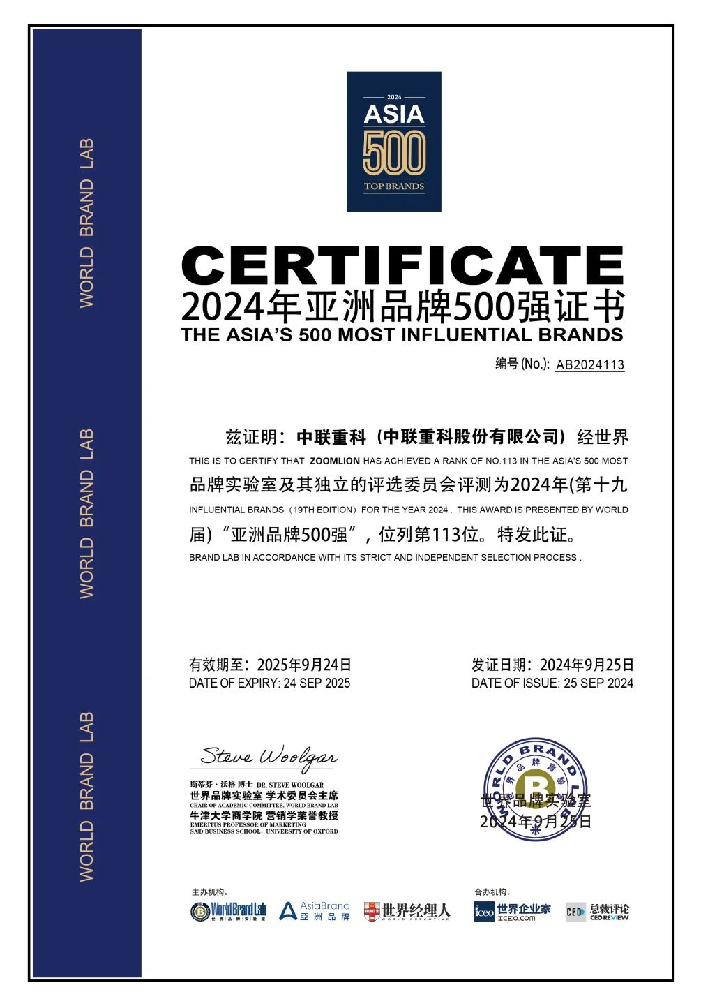 ▲中联重科《2024年亚洲品牌500强》证书