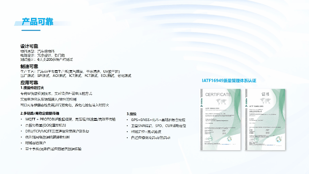 软件安全:符合汽车要求的MBD开发,符合国标的独立保险丝控制策略;接插件防打火专利型负载检测技术,多链路/高稳定数据传输技术,GPS+GNSS+北斗+基站复合定位;40+告警/40+保护,出现故障时可在100ms内切断MOS,并立刻触发故障上报机制。