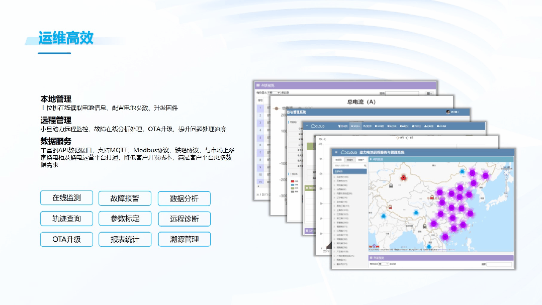 降低运维成本:F733支持上位机在线读取电池信息/配置电池参数/升级固件,通过云平台实现故障远程诊断和程序OTA升级,降低运维成本。丰富的API数据接口与市场主流换电柜及换电运营平台打通,降低开发成本。