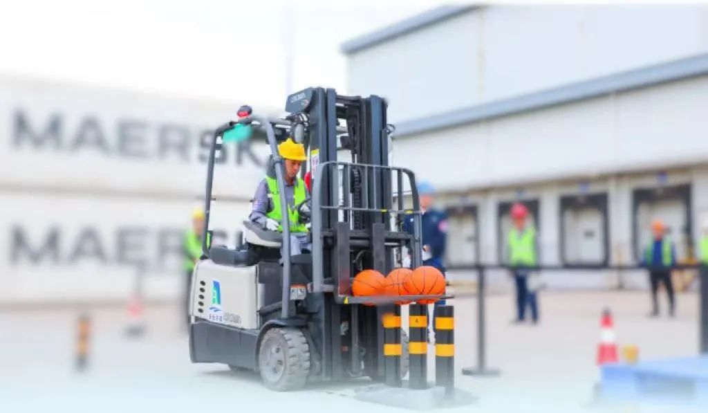 操作员需要用货叉一次性端起三个篮球,倒车绕桩行驶至另一面的三个球柱后,将三个篮球一次性摆放在球柱上。