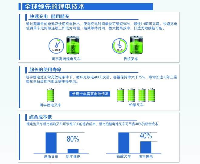 这种选择背后,是深思熟虑的经济账。以明宇第六代锂电叉车为例,虽然初始投资较传统燃油叉车略高,但性价比很快就能显现:每天1小时的快速充电就能满足全天工作需求,相比传统叉车大幅降低了能源成本;12000小时的超长电池寿命意味着10年以上的稳定服务,期间几乎无需更换重要部件;零维护的特性更是让运营成本降到最低。