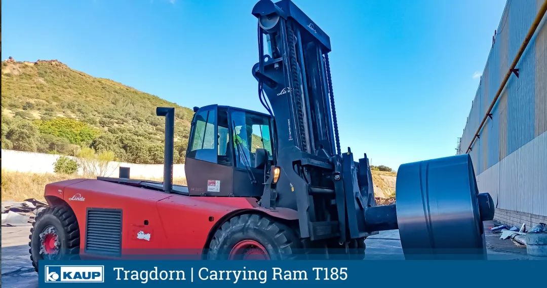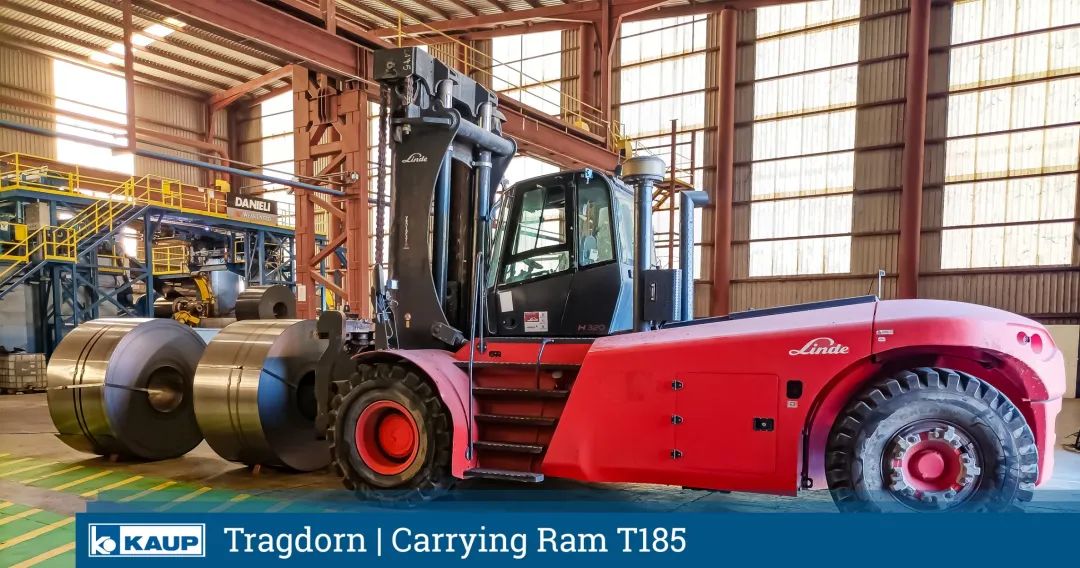 这是一个巨大的组合!KAUP 60T185串杆安装在林德H320叉车上。这种坚固的属具和大型叉车的组合可以处理重达30吨的金属板卷。
