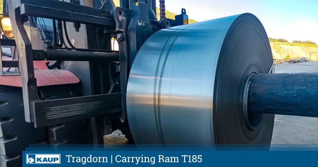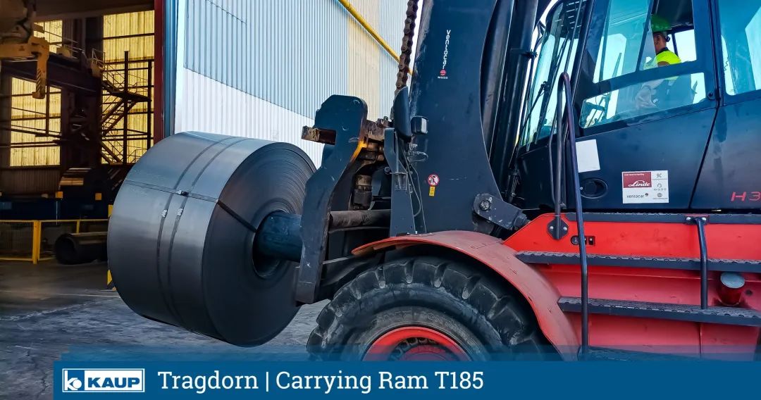 That's a huge combination! A KAUP Carrying Ram 60T185 in steel tube version at a Linde H320. This combination of robust attachment and big forklift truck was made to handle sheet metal coils weighing up to 30 tons.
