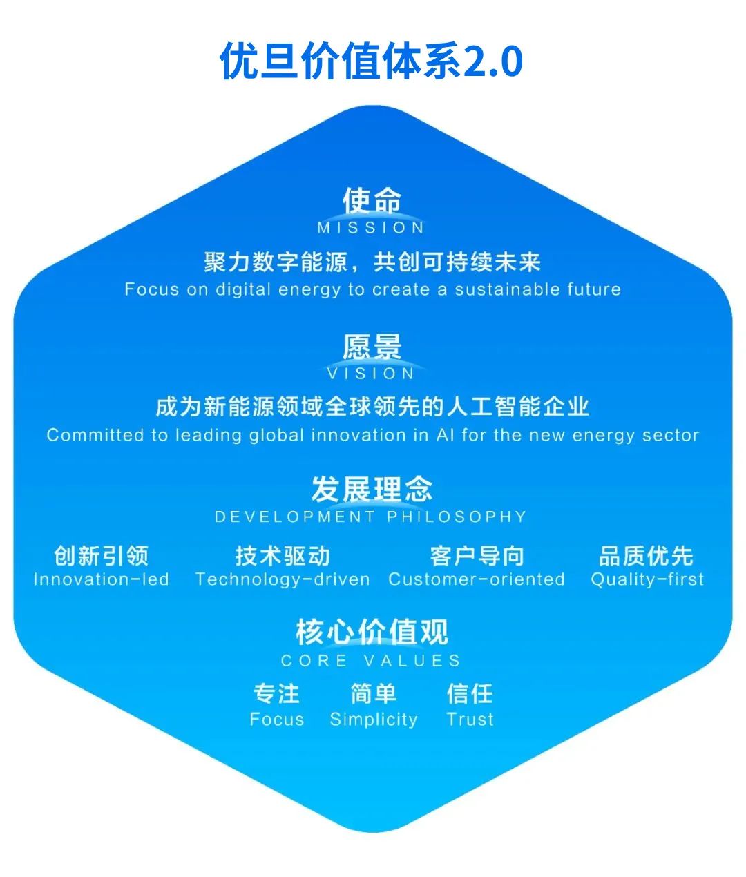 优旦价值体系2.0全新发布,明确企业使命为「聚力数字能源,共创可持续未来」,企业愿景为「成为新能源领域全球领先的人工智能企业」。