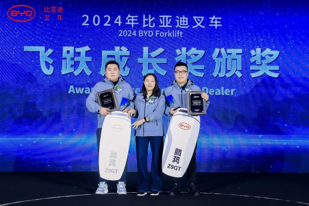 大会同时颁发了飞跃成长奖、卓越经销商奖、以及杰出经销商奖,并对在2024年销售业绩表现突出的优秀经销商进行了奖励,以感谢他们对比亚迪叉车发展做出的贡献。