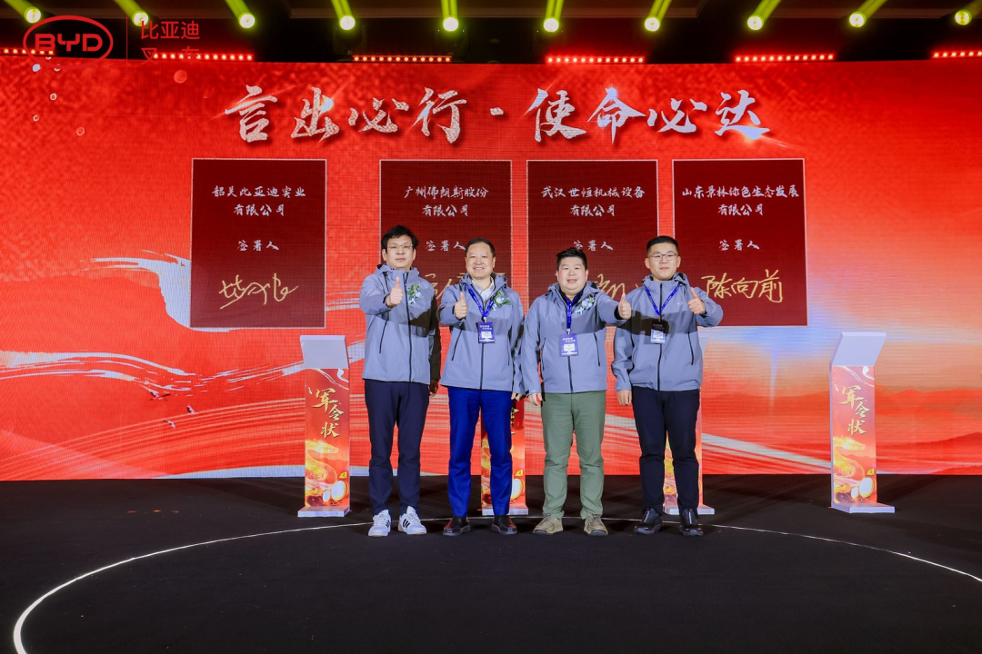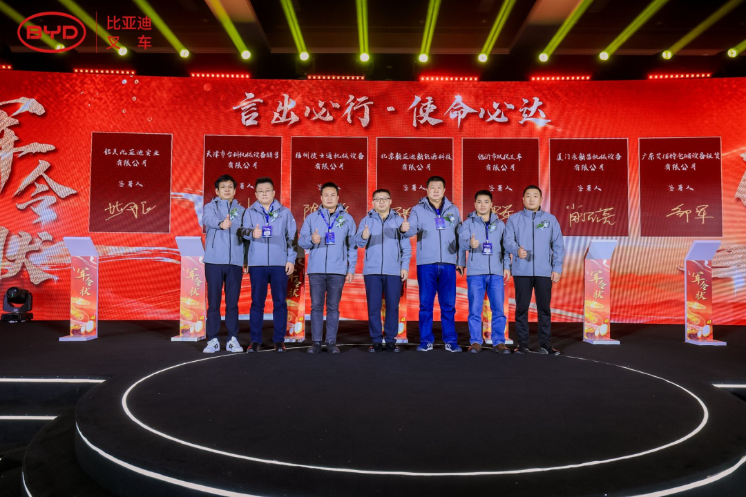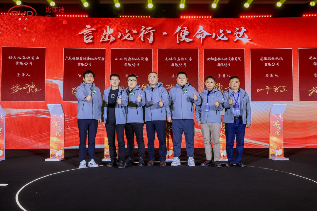 会议的高潮部分是“签署军令状”仪式。比亚迪叉车总经理毕国忠与经销商代表共同签署了2025年的销售目标协议,这一重要时刻不仅彰显了双方在合作中的高度信任与紧密协作,更象征着比亚迪叉车在新的一年中将继续携手同行,共同迎接市场挑战,创造更加辉煌的业绩。