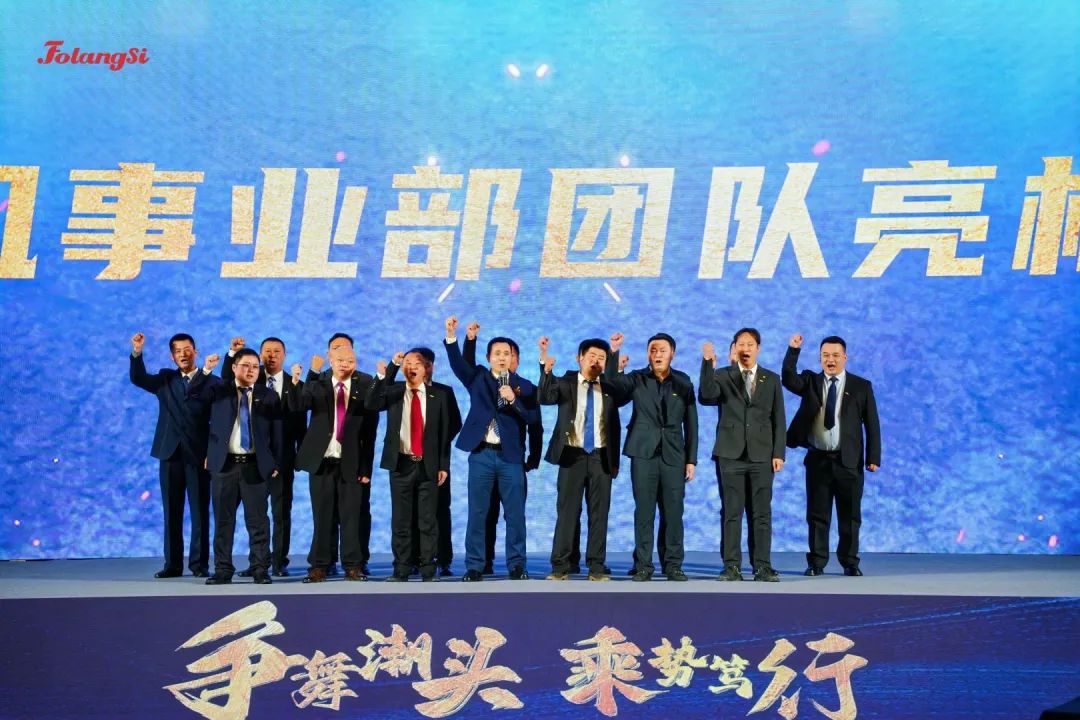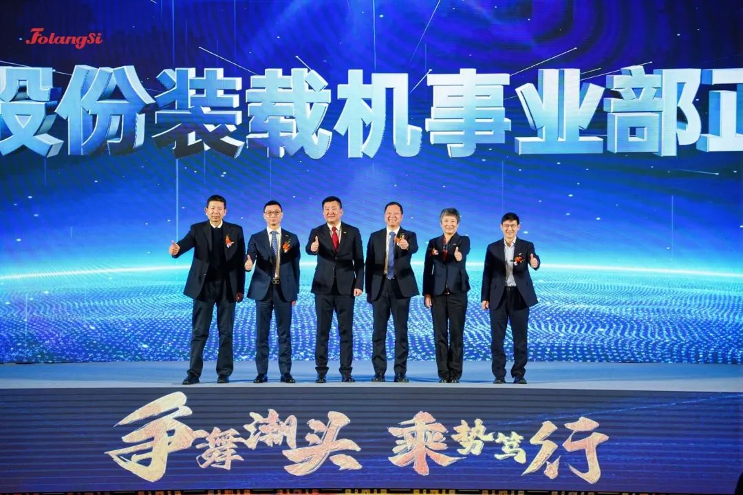 2024年初,公司确立了强网络、扩品类、国际化的发展战略。经过深入的市场调研和充分的内部探讨,公司最终选定电动装载机作为扩品类的重点方向。在短短的时间内,电动装载机业务已经取得了显著的业绩。大会上,特别举行了隆重的佛朗斯装载机事业部成立仪式。装载机事业部团队也发出了振奋人心的口号:发奋图强、争分夺秒,确保圆满完成2025年任务指标!