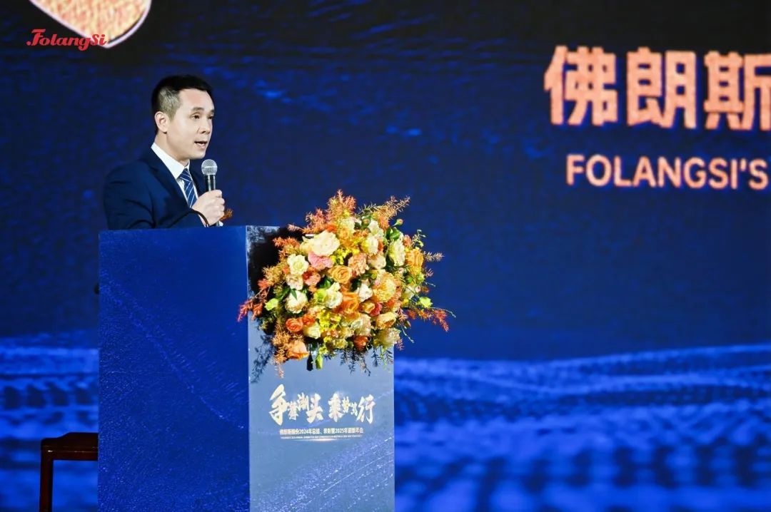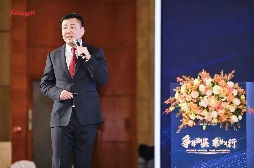 会议的最后,迎来了最为期待的环节—公司董事长侯泽宽先生作总结发言。他以“破局内卷·向新进化”为主题,为这场盛会带来了深刻而富有远见的思考。董事长首先代表公司向全体同仁表达了衷心的感谢和崇高的敬意, 感谢大家在过去一年中的辛勤付出与卓越贡献。随后,他回顾了2024年国际局势的风云变幻、国内市场的跌宕起伏以及行业的沉浮兴衰,强调正是这些瞬息万变的时代背景塑造了佛朗斯人坚韧不拔的品质。