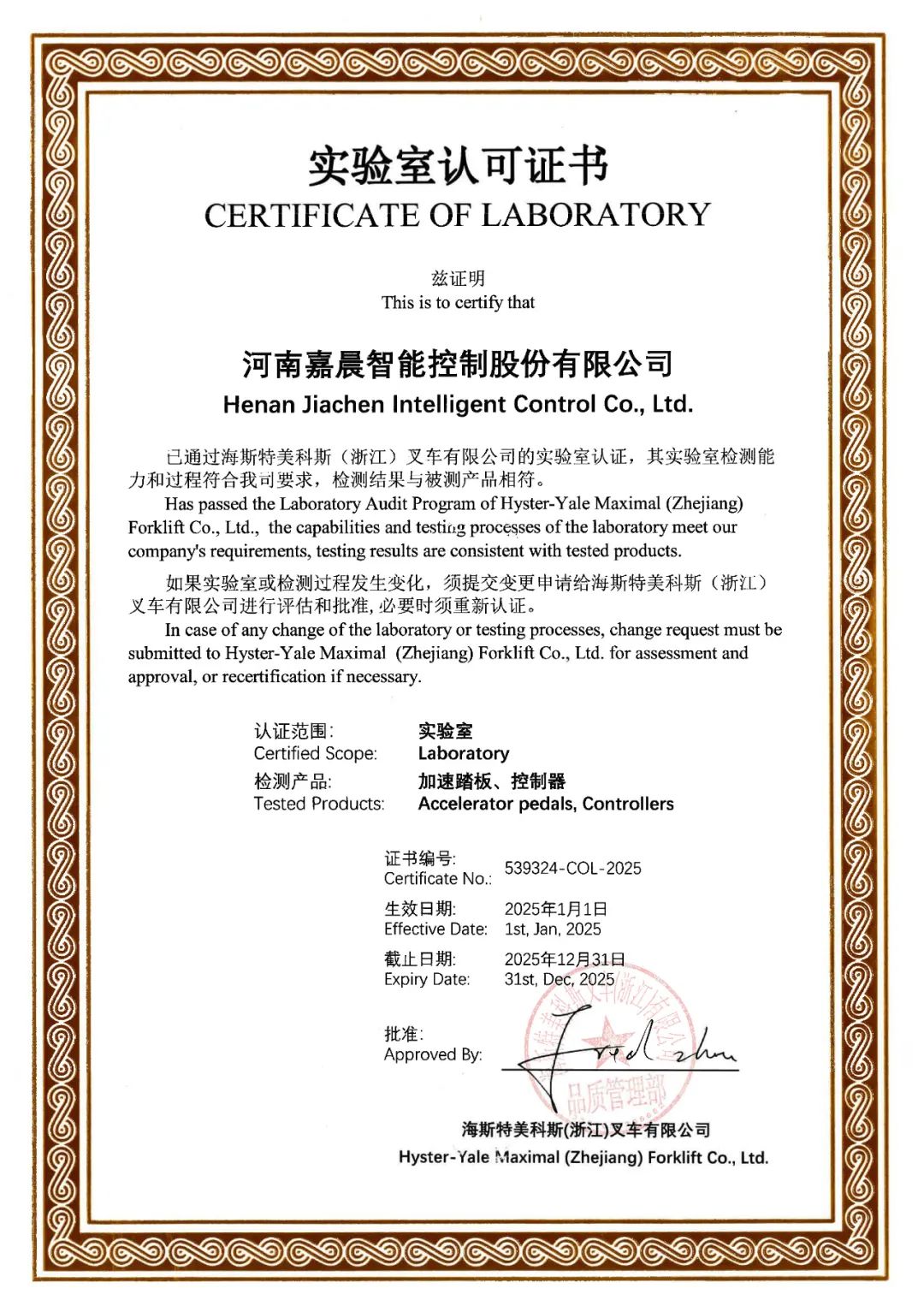 近日,河南嘉晨智能控制股份有限公司成功通过海斯特美科斯 (浙江) 叉车有限公司的实验室认证。