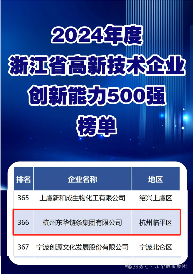日前,浙江省高新技术企业协会组织开展高新技术企业创新能力评价工作,评选出2024年度浙江省高新技术企业创新能力500强。东华再次荣登榜单。
