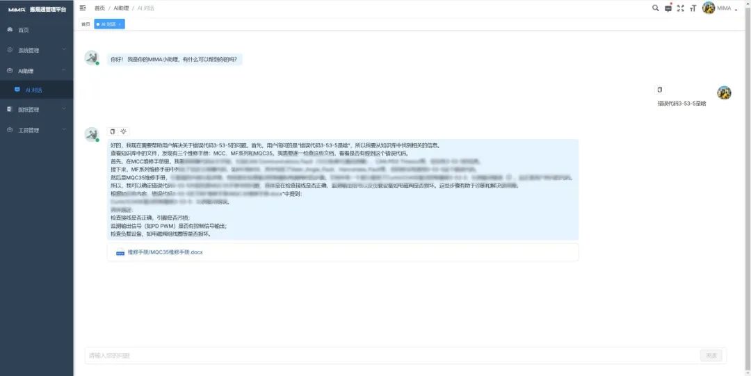 体系文件是企业运营的 “指南针”,涵盖质量管控、流程优化等关键领域。合肥搬易通(MiMA米玛)以往依赖人工整理体系文件,流程繁杂,效率低下,业务扩张带来文件数量激增,传统方式难以招架。接入DeepSeek后,可以运用自然语言处理技术,快速抓取文件关键信息,智能分类并构建索引,帮助员工高效检索。同时,DeepSeek可以实时追踪行业法规与企业流程变化,分析数据给出优化建议,有效保障体系文件的科学性、有效性和合规性 。