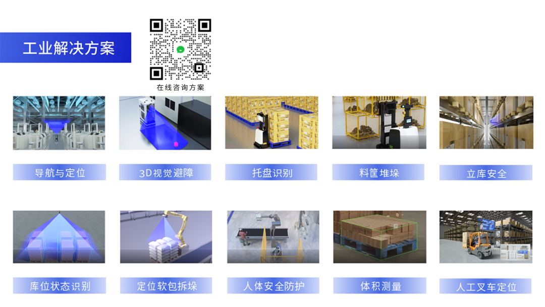 十大解决方案涵盖导航与定位、3D视觉避障、托盘识别、料筐堆垛、立库安全、库位状态识别、定位软包拆垛、人体安全防护、体积测量、人工叉车定位等多个应用场景,为物流行业数字化转型和智能化升级提供全方位技术支持。