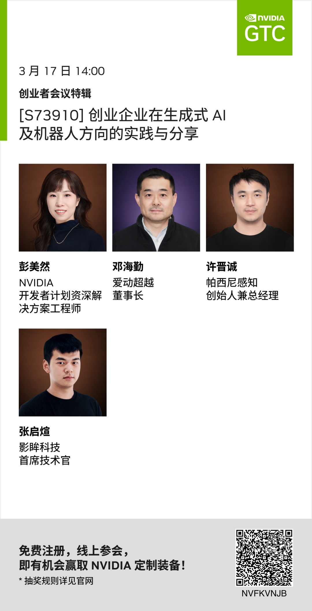 NVIDIA GTC 2025大会将于3月17-21日在在美国加州圣何塞市中心举行,届时线上大会将同步举行。爱动作为NVIDIA 初创加速计划的优秀会员,正式确认受邀参与此次盛会,并将于北京时间3月17日(周一)下午2:00-3:00参与线上的特别演讲环节,在“创业企业在生成式 AI 及机器人方向的实践与分享”演讲中,分享爱动在工业车辆装备行业中的创新应用。