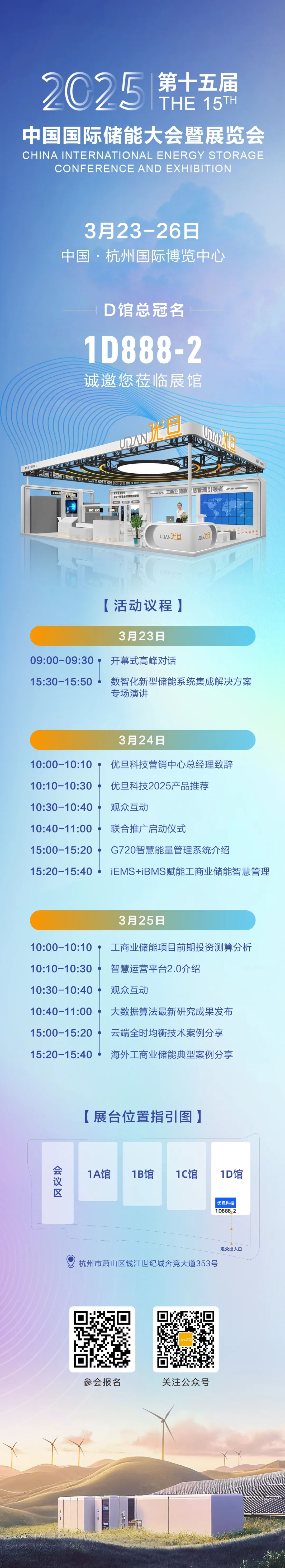 3月23日至26日,第十五届中国国际储能大会暨展览会(CIES2025)将在杭州国际博览中心盛大召开。作为工商业储能智慧管理领军企业,优旦科技将全面展示在储能数智化运营、技术创新及产业链协同方面的领先实力,为行业带来一场智慧储能璀璨盛宴。