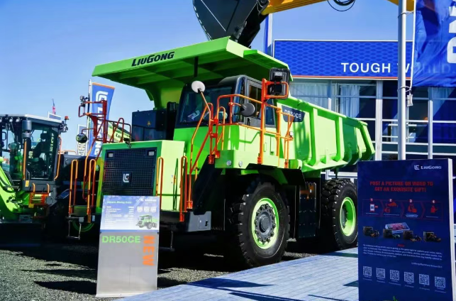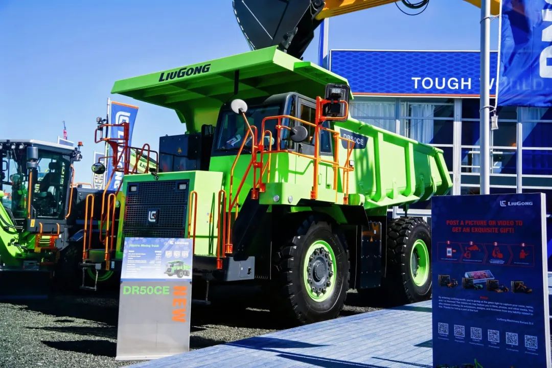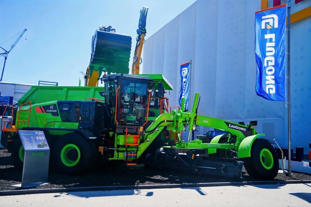 柳工拥有行业领先的电动化设备矩阵,此次展出的五款前沿电动产品包括870HE轮式装载机、924FE和9018FE挖掘机、DR50CE刚性矿卡,以及全球首款24吨级电动平地机4280DE。