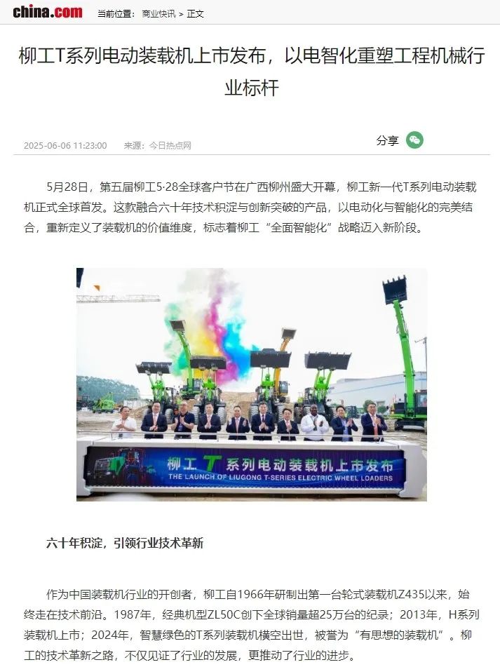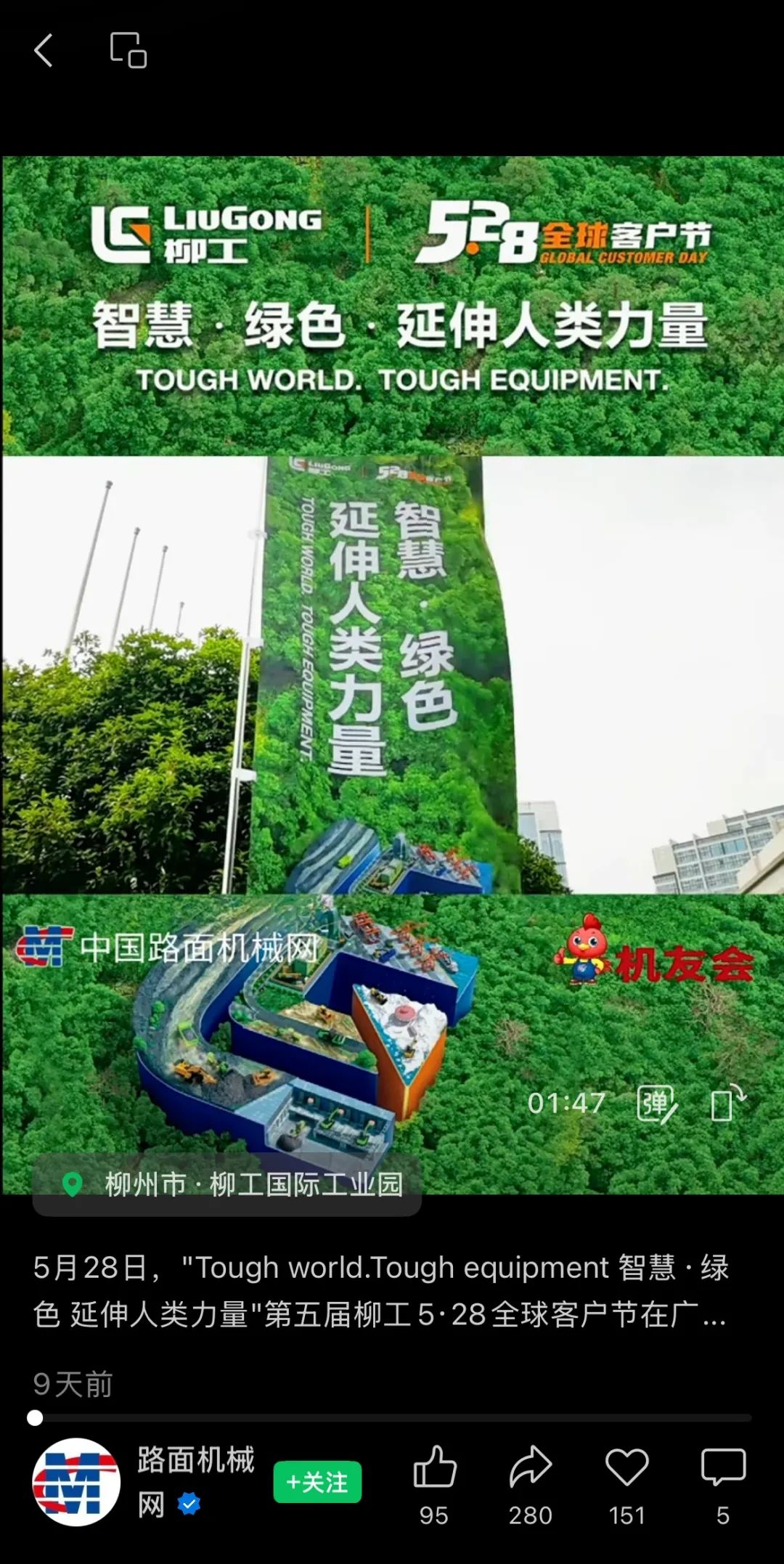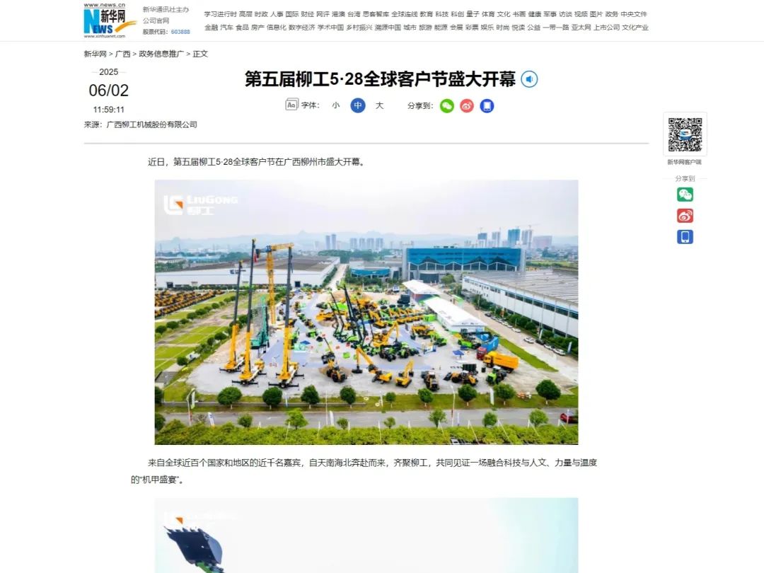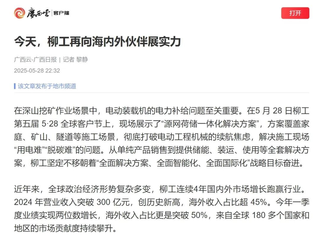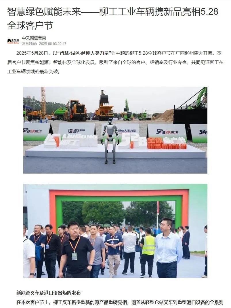 5 月 28 日,第五届柳工 5・28 全球客户节在广西柳州盛大启幕,以“智慧・绿色・延伸人类力量” 为主题,向全球客户展示工程机械领域的创新成果。活动举办至今,广西新闻、中国新闻网、新华网等权威媒体,以及多家行业媒体、多个行业KOL聚焦柳工,深度关注柳工电动化与智能化技术突破、海外市场业绩增长以及未来发展规划。作为行业领军企业,柳工以技术革新与全球化视野,再次成为工程机械领域高质量发展的舆论焦点。