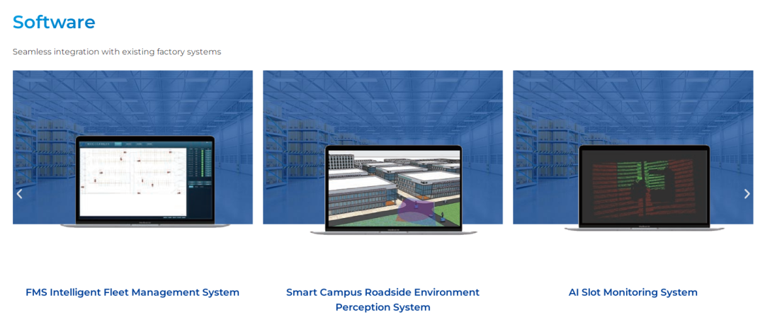 英文官网不仅展示硬件产品,更突出场景化、系统化、智能化的行业解决方案。方案融合了镭神智能3D SLAM智能搬运设备和自研的FMS多机调度系统、WMS、WCS系统、AI库位检测系统、园区路端环境感知系统等软件系统。