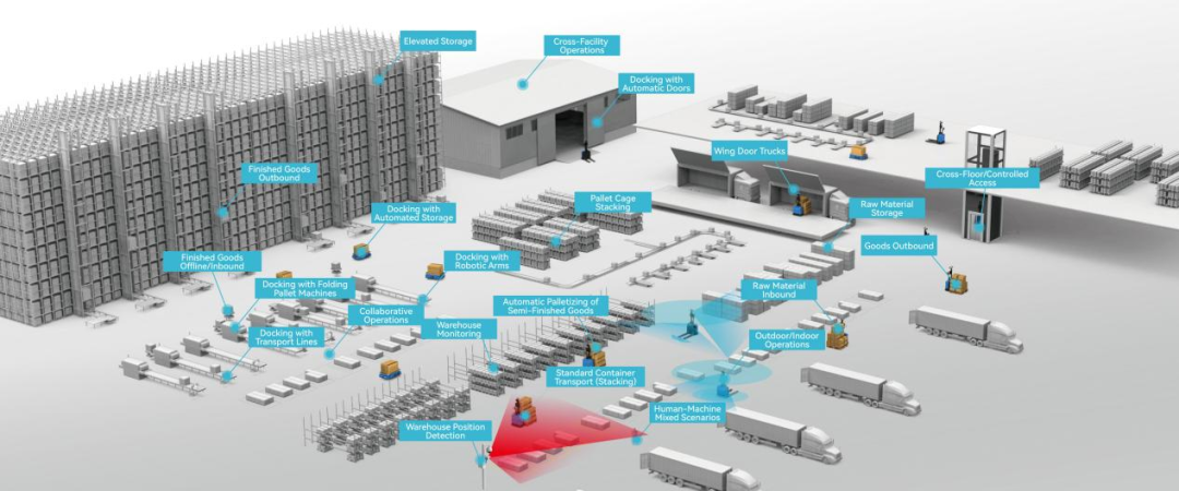 围绕工厂 - 物流 - 仓库体系,镭神智能针对不同企业室外和室内不同场景的物料运输全流程,涵盖从原材料到货转运、车间生产物料精准配送、成品下线搬运,直至出货转运等各个环节,提供智能搬运解决方案。为客户打造真正可落地的智能制造与智慧物流体系。