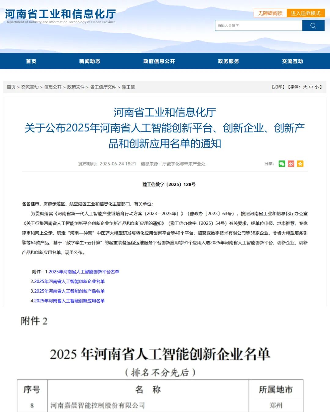 喜报丨嘉晨智能成功入选河南省第一批数据企业、2025年河南省人工智能创新企业