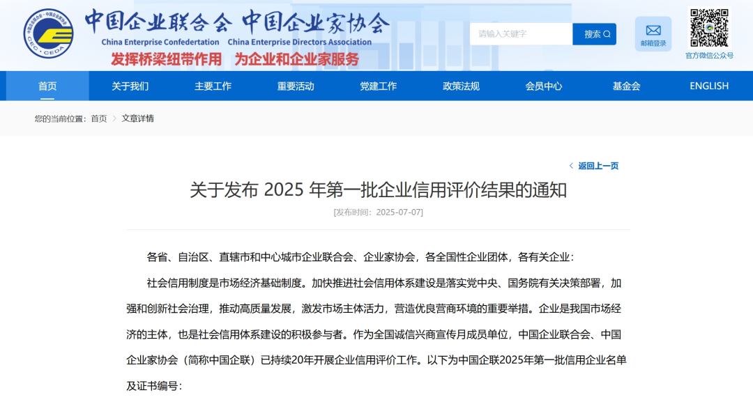 近日,中国企业联合会、中国企业家协会严格遵循“申请-评价-审核-公示”程序,经多维度综合评审后公布了2025年全国第一批168家AAA级信用企业名单,龙合智能凭借在诚信建设和信用管理方面的卓越表现荣耀登榜!这既是对公司“真诚,感恩,世界本是一家人”经营理念的充分肯定,也是对我司长期深耕信用体系建设的认可。