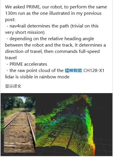 SNCF的工程师团队最近分享了一段视频,详细展示了他们如何将 nav4rail 与一个 LIDAR专用障碍物检测模块成功结合并进行测试。而此次测试中,镭神智能的CH128X1激光雷达成为检测系统的“慧眼”,为机器人精准感知周围环境提供了有力支持。