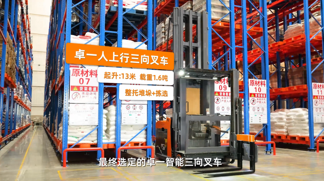 客户案例|从分散式地堆到13米高位密集存储,卓一人上行三向叉车赋能调味品行业