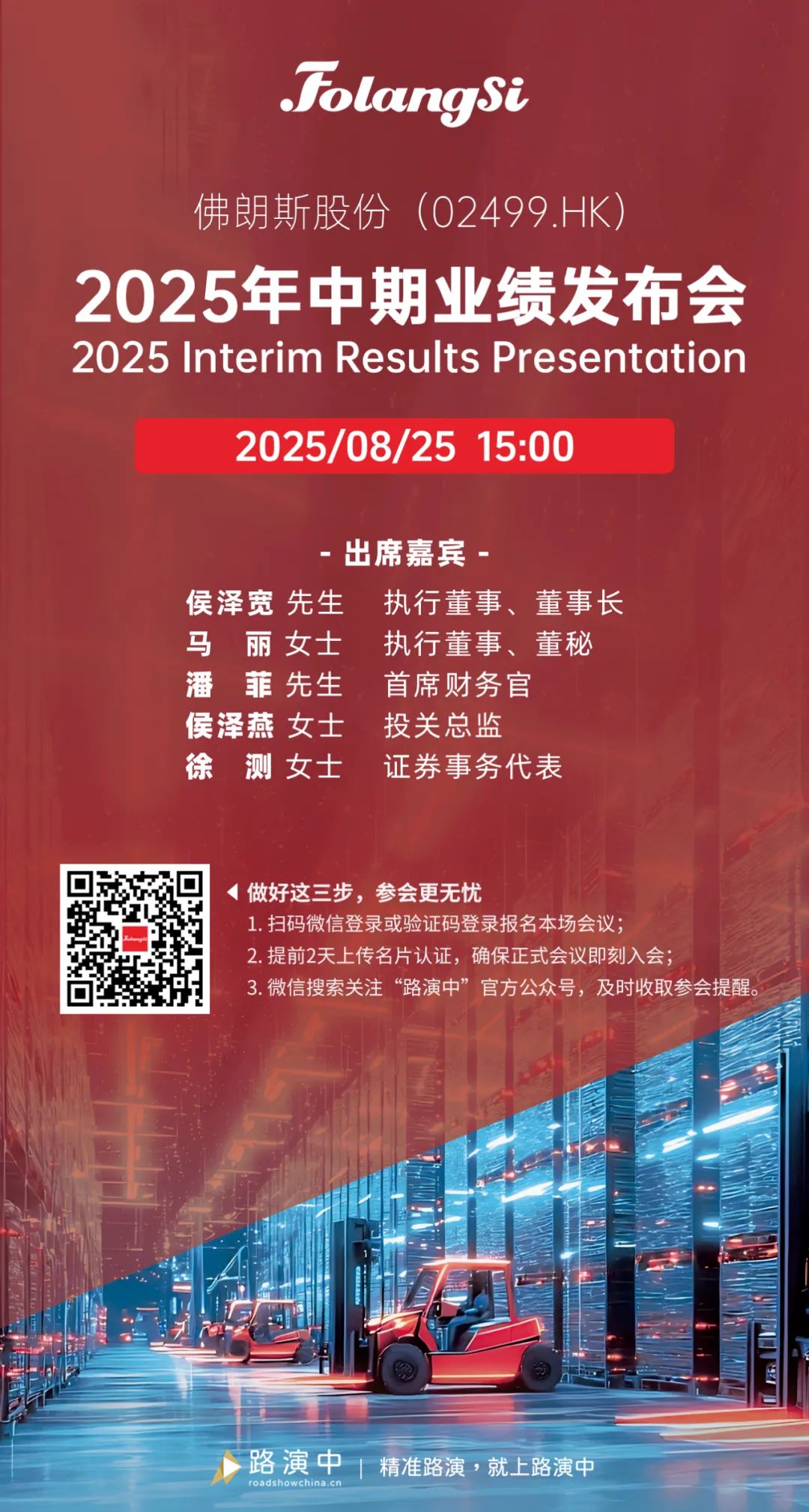 我们诚挚邀请您参加将于2025年8月25日下午15:00 召开的佛朗斯股份2025年中期业绩发布会。