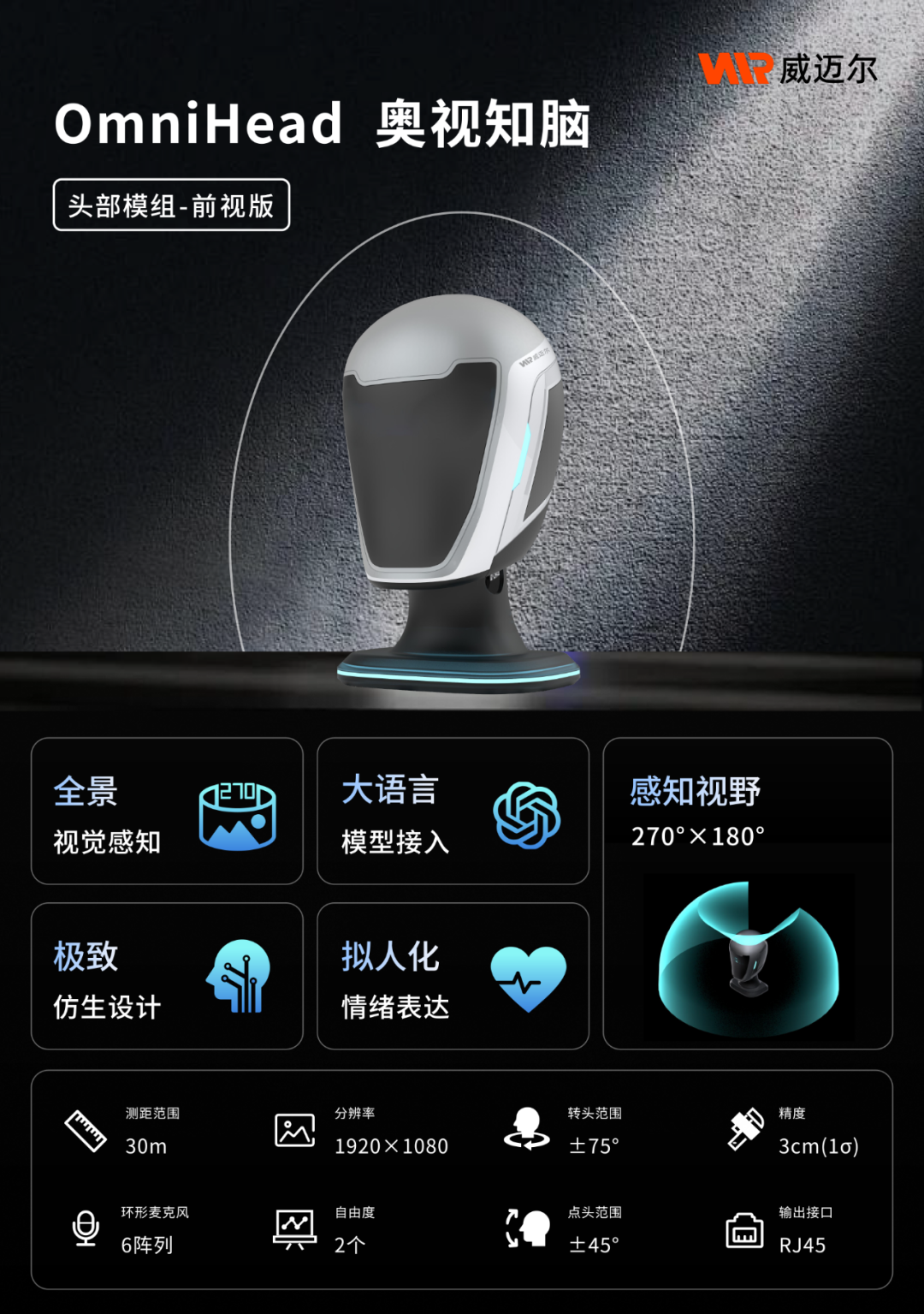 要推动人形机器人具备“自主环境探索、动态语义理解、精准人机协作、精细任务执行” 的类人能力,必须从根源上突破 “多模态感知融合” 与 “认知决策联动” 的关键技术。而 OmniHead(奥视知脑)人形机器人头部模组,正是贯通“感知 — 认知 — 决策 — 执行”一体化架构的核心硬件载体,为构建这一能力体系提供了关键支撑。