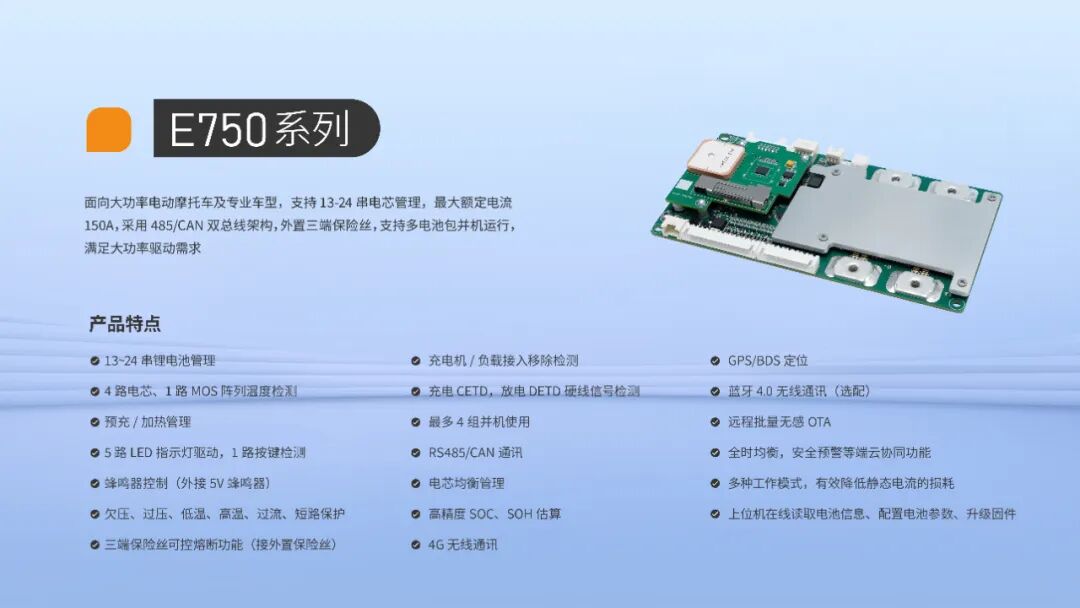 E750系列:面向大功率电动摩托车及专业车型,支持13-24串电芯管理,最大额定电流150A,采用485/CAN双总线架构,外置三端保险丝,支持多电池包并机运行,满足大功率驱动需求。