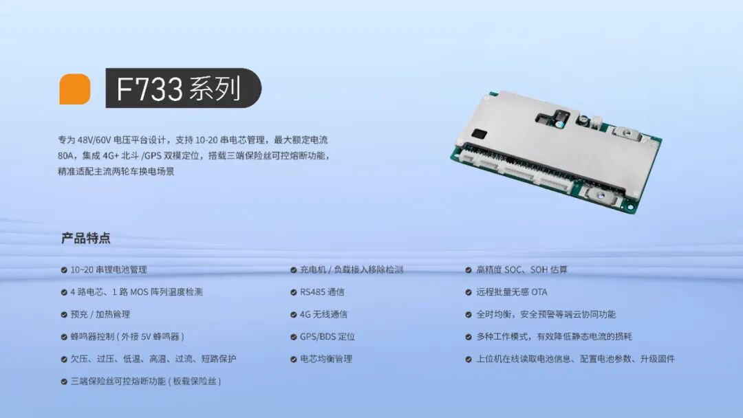 F733系列:专为48V/60V电压平台设计,支持10-20串电芯管理,最大额定电流80A,集成4G+北斗/GPS 双模定位,搭载三端保险丝可控熔断功能,精准适配主流两轮车换电场景。