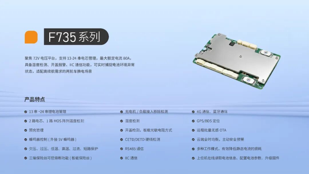 F735系列:聚焦72V电压平台,支持13-24串电芯管理,最大额定电流80A,具备湿度检测、开盖报警、IIC通信功能,可实时捕捉电池环境异常状态,适配高续航需求的两轮车换电场景。