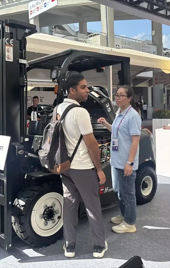TCF外贸副总李欢向客户介绍该款产品:军创荣耀叉车是一款重新定义性价比的产品,它采用了309V高压平台,配合30kW大功率永磁同步电机,在高强度的作业节奏下,动力性能依然表现卓越,超越同级燃油叉车。我们深知续航与电池寿命是客户的关切核心,该款叉车搭载宁德时代原厂电池包,满电综合工况续航8小时,并提供8年的电池质保,彻底打消续航焦虑,同时为企业节省大量运营开支。