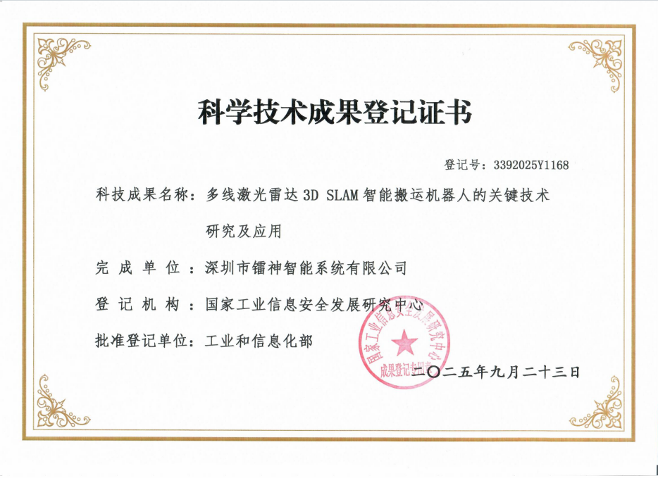 此次获得工信部科学技术成果登记证书,不仅是对镭神智能技术实力的权威认可,更标志着公司在智能制造与智慧物流领域的持续创新与引领。