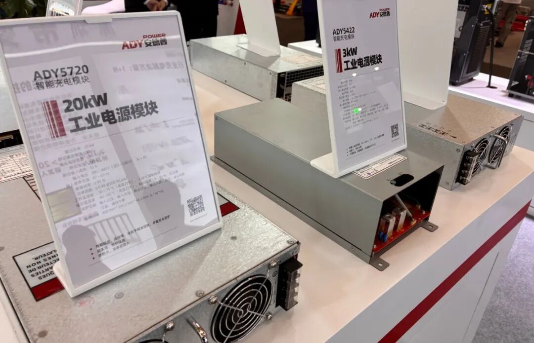 安德普此次展出的产品线覆盖了从电动叉车、牵引车到AGV/AMR等各类设备适用智能充电机,包括智能充电机核心部件——自研智能电源模块,模块化设计让产品可以像搭积木一样灵活组合,轻松应对不同场景的复杂需求,无论是需要高频次、快补电的潜伏式AGV,还是需要大功率、长续航的平衡重叉车,安德普都能提供量身定制的充电解决方案。